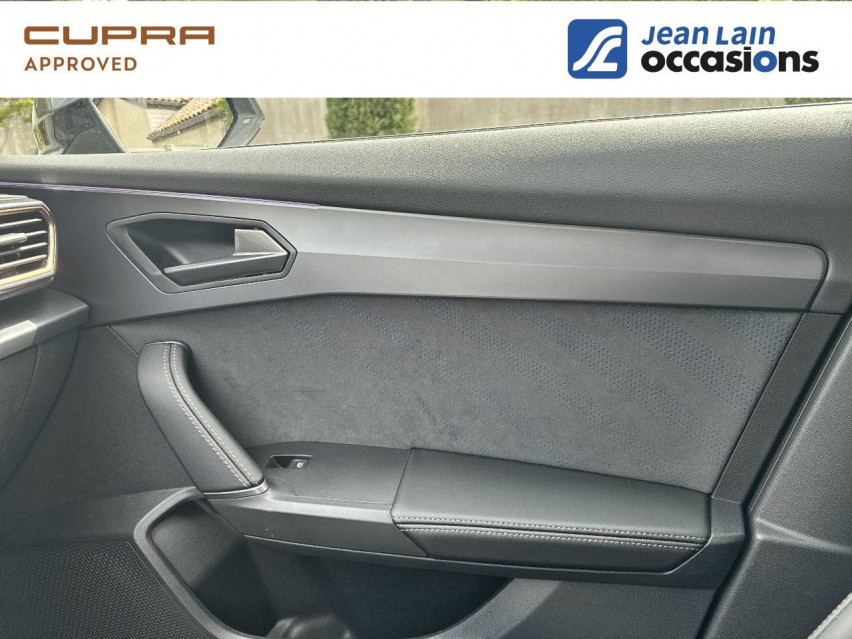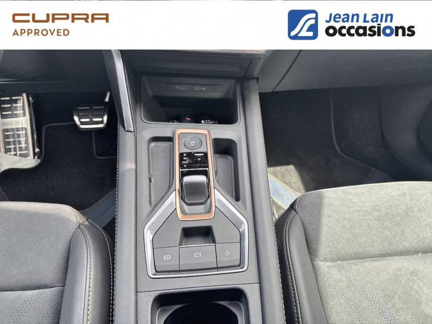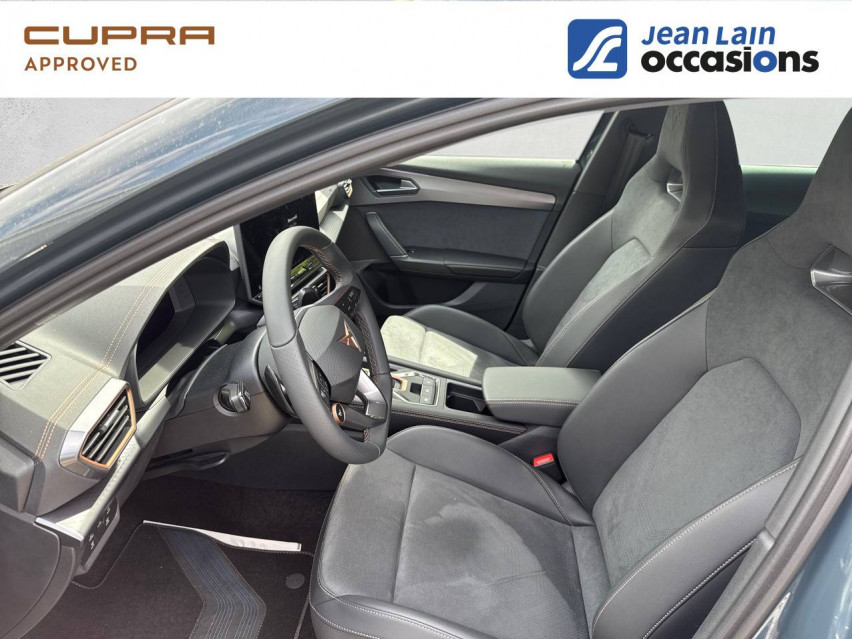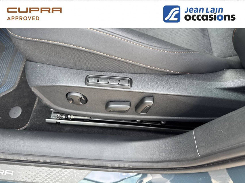 - Design intérieur Dynamic - Sièges baquets suédine Noir Asphalte avec poinçonnage Bleu Astral et surpiqûres cuivrées - Logos CUPRA estampés sur les appuie-têtes - Planche de bord noire surpiquée avec inserts Dark Alu - Contre-portes suédine noire avec poinçonnage Bleu Astral - Siège conducteur : chauffant avec réglage électrique à mémoire, y compris réglage lombaire - Siège passager : chauffant avec réglage manuel de la hauteur