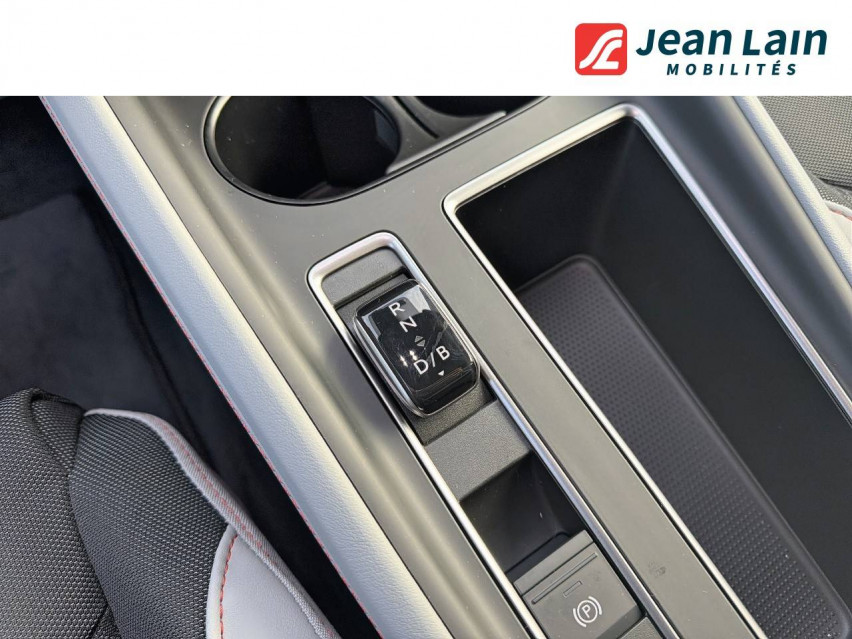 - Design intérieur Lodge - Sellerie tissu noir recyclé, matériau synthétique gris clair et surpiqûres orange et noires - Ceintures orange et ciel de toit noir - Insert décoratif gris foncé pixel sur planche de bord / contre-portes - Habillage matériau synthétique gris clair sur planche de bord / contre-portes - Eclairage d'ambiance intérieur personnalisable sur tableau de bord