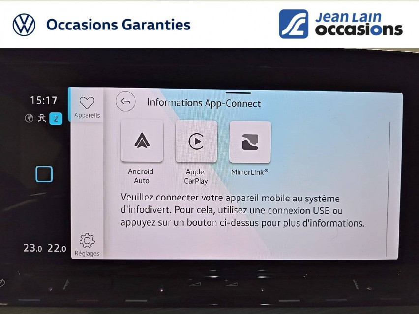 - App-Connect sans fil: affichage et contrôle via l'écran tactile de la voiture, du contenu, des fonctions et des applications compatibles présents sur le Smartphone (compatibilité avec les systèmes Apple CarPlay et Android Auto). Fonction sans fil uniquement disponible avec Apple CarPlay